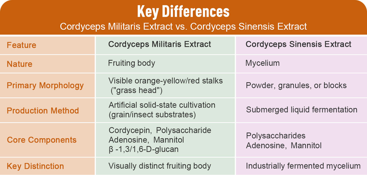 Cordyceps Militaris and Cordyceps Sinensis, with their similar-sounding names and reputations as nutrient-dense natural products, are frequently conflated in the market and among consumers. Both have carved out significant niches in the fields of health preservation, functional food, and cosmeceuticals due to their rich biological active ingredients. However, they differ fundamentally in terms of biological nature, growth patterns, morphological characteristics, and practical applications. Clarifying these differences is not only crucial for consumers to make informed purchasing decisions but also essential for industry professionals to ensure accurate product development and marketing.